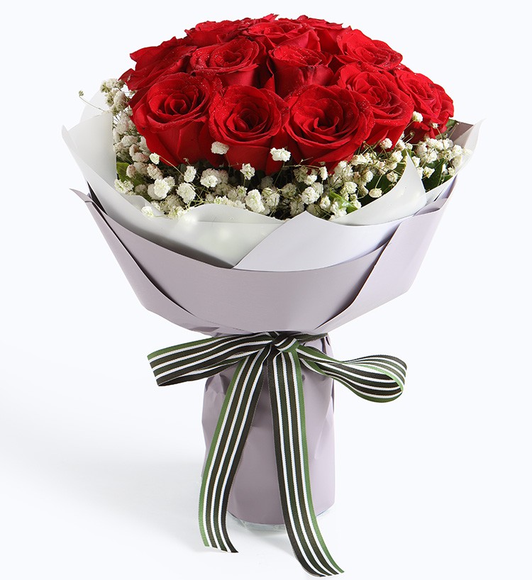 Buque de flores com 50 rosas vermelhas embaladas em 2 camadas de embalagem de papel com enchimentos sazonais.