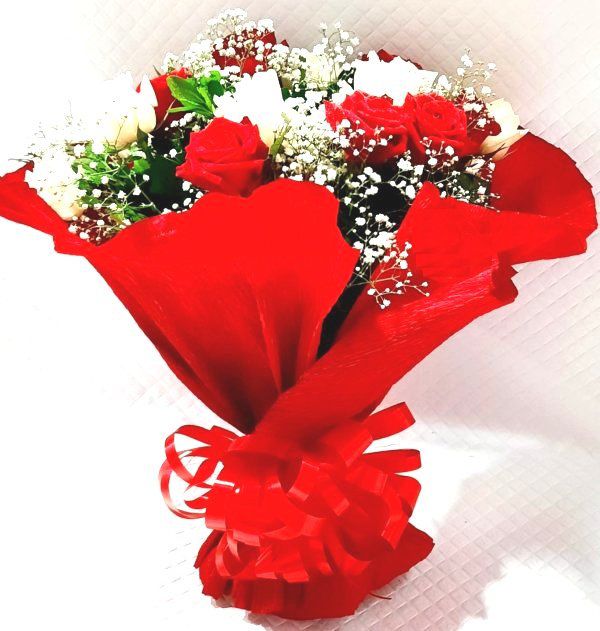 Buquê com 24 lindas rosas naturais vermelhas e brancas com folhagem e complemento. Embalagem especial super crepe vermelho.