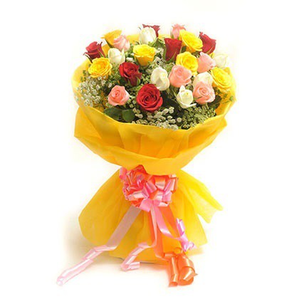 Um buquê de 25 rosas de cores mistas em uma embalagem de papel premium com laço de fita rosa e vermelho.
