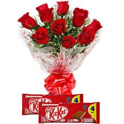 Deslumbre a pessoa querida, presenteando-os com este Buquê Encantador de 10 Rosas Vermelhas com 2 Kit Kat Nestlé (4 Fingers-10 gms) em suas ocasiões especiais para torná-lo mais brilhante e feliz.