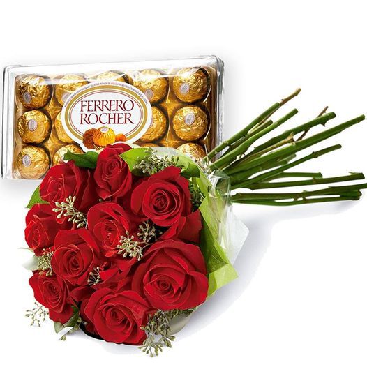 um belo buquê com 9 rosas vermelhas e delicadas folhagens, acompanhando de uma caixa de bombons Ferrero Rocher .